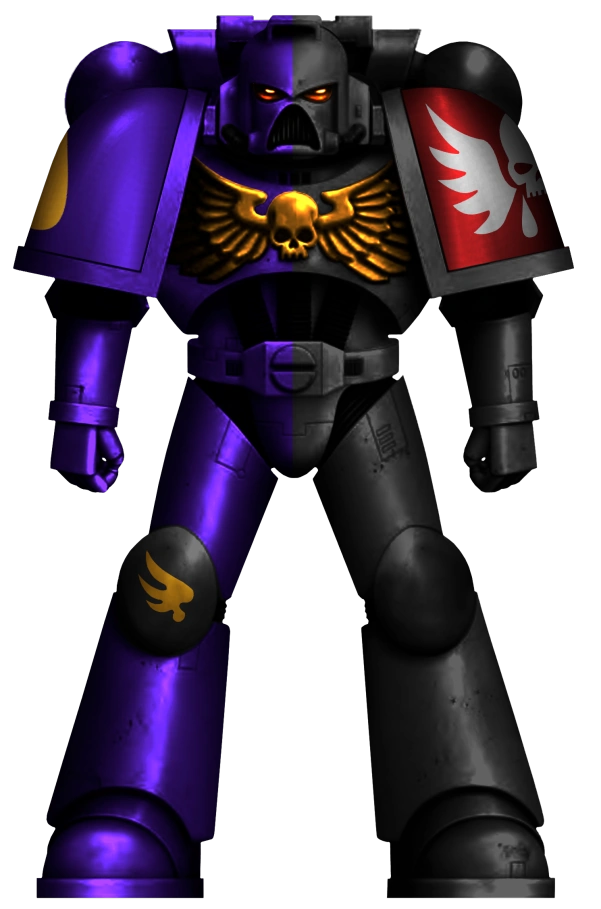 - 1st Company (Veteran): A black Crux Terminatus or a single black blood drop over purple background on the right shoulder plate. On Terminator (Tactical Dreadnought) Armour, the left shoulder plate shows the 1st Company's specific heraldry, the right shoulder guard displays the Chapter badge in black (red for Sergeants).