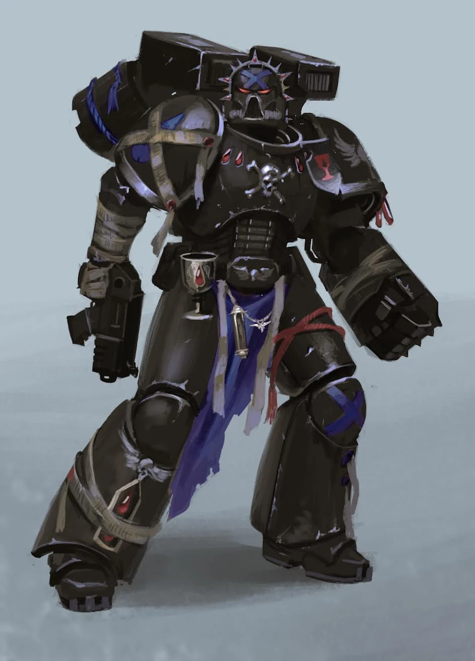- Chaplains - The chapter has a unique approach to the role of Chaplains, as they focus entirely on guarding against the horrors of the Black Rage and providing psychological support to those who succumb to it or the equally dangerous curse of the Red Thirst. The Chaplains duties also include safeguarding the Chapter's secrets, upholding its beliefs, and monitoring the mental health of their brothers. The Reclusiarchs, the highest-ranking Chaplains, oversee the Chapter's most sacred shrine, the Reclusiam. Situated in the heart of the Battle Barges, the Reclusiam is adorned with relics and banners of past glories, and it serves as the location for important ceremonies. The rosters of the Chapter's achievements, great victories, and legendary heroes are also preserved here.