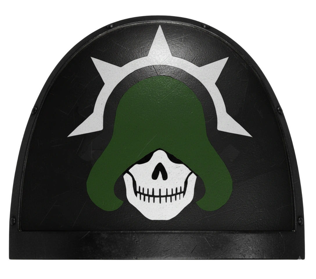 The Chapter badge is a green-hooded, white skull crowned with a white halo centred on a black field, representing their devotion to duty, purity of purpose, and connection to their parent chapter heritage .