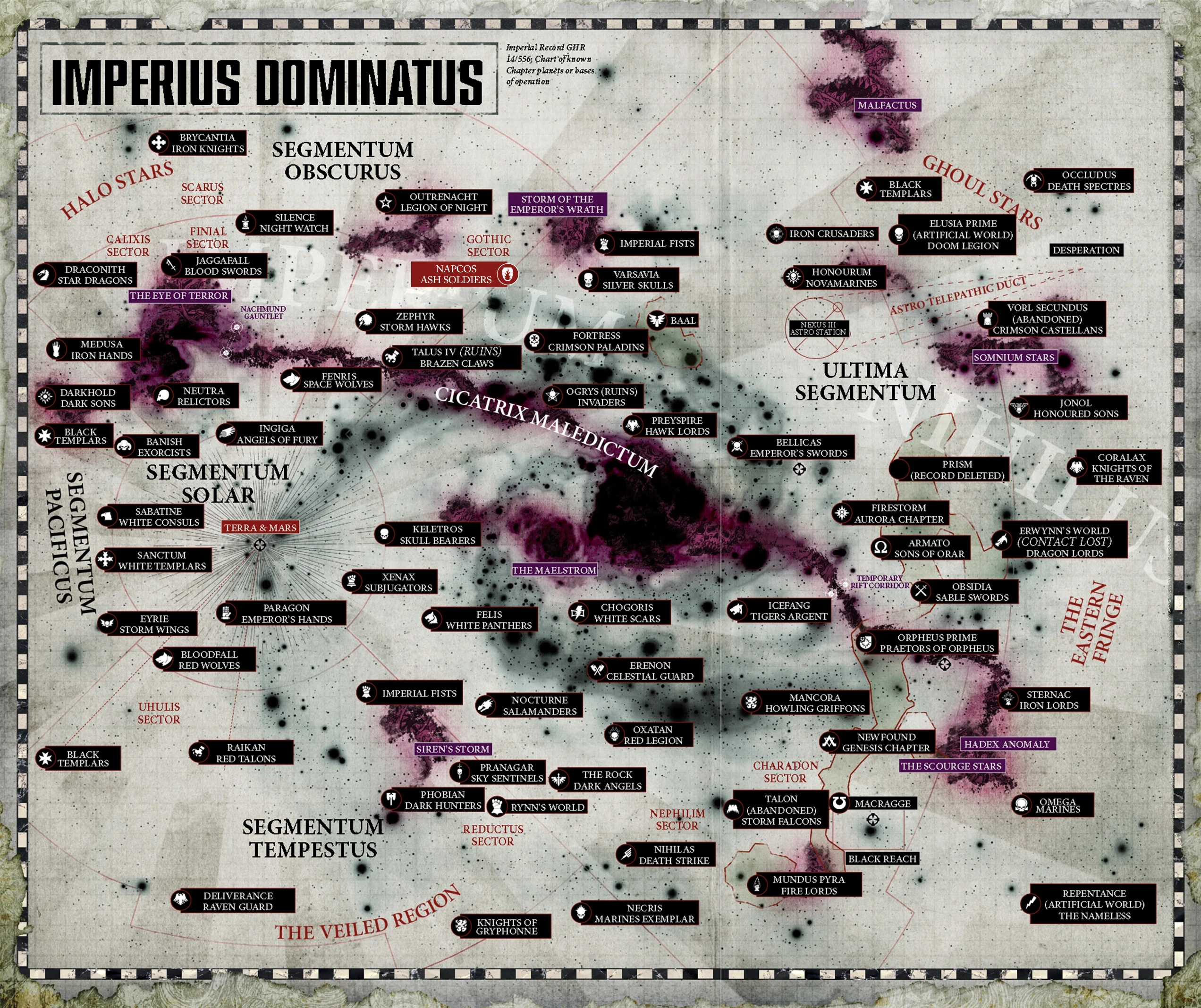 Current map of the galaxy with information on various chapter homeworlds showing the location of the Milky Way and Imperial Segments after the formation of the Great Rift in 999.M41. Highlighting the location of Napcos, homeworld of the Ash Soldiers.