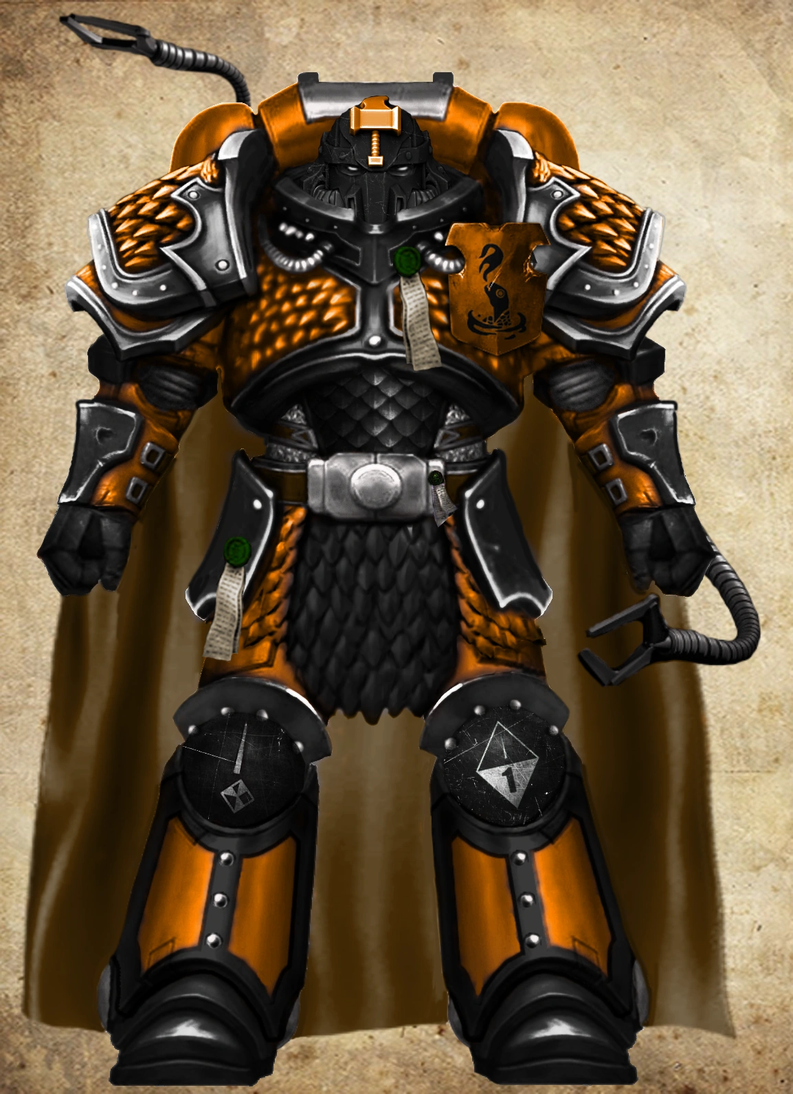 Their colours being a metallic orange with black trims, their armour is often shaped into the appearance of scales rather than flat plates. This is however not a requirement for anyone, and some choose not to.