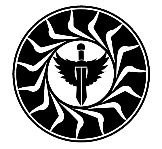 The Celestial Knights' Badge is a black and winged sword within a black sun upon a field of white.