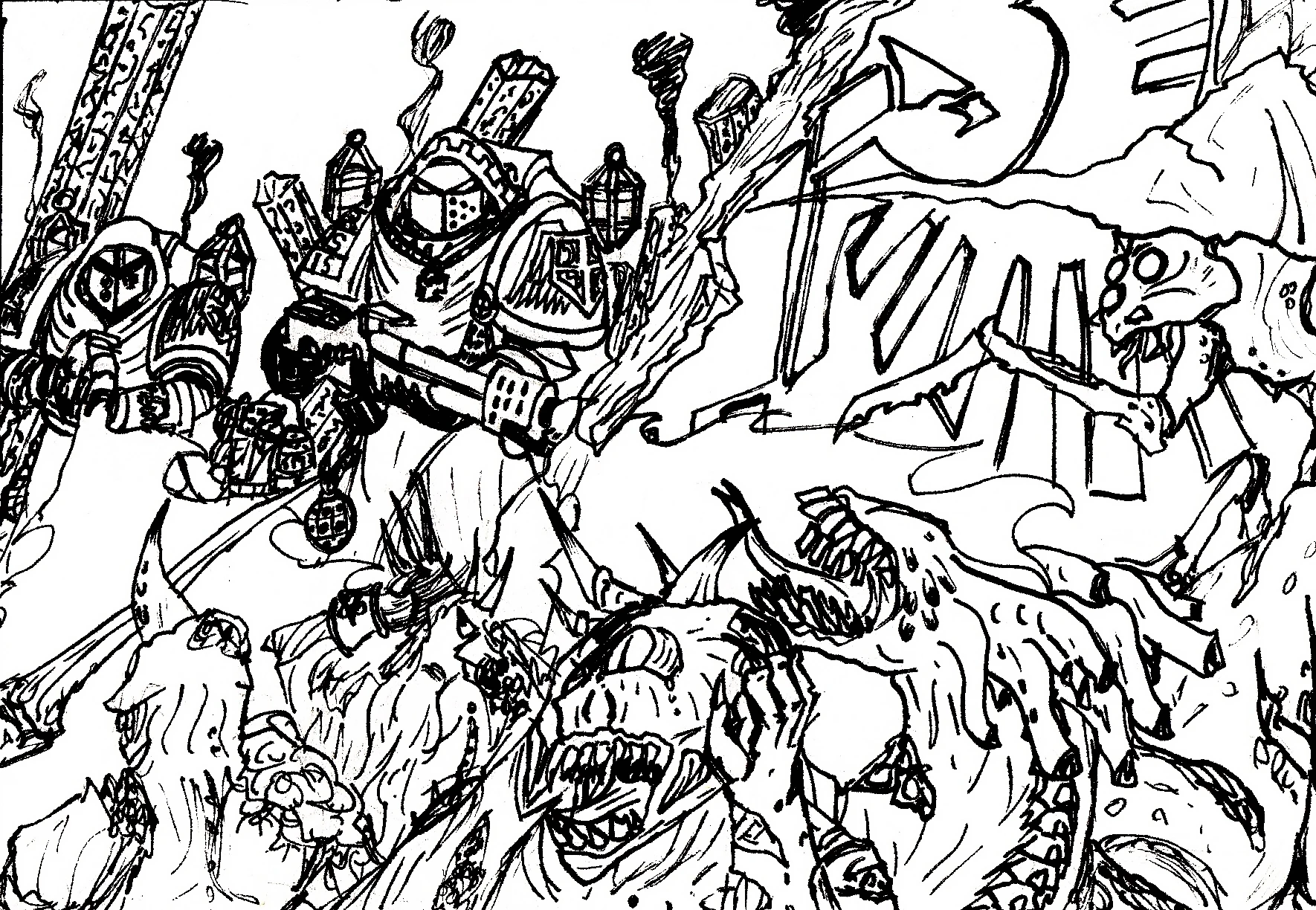 The origins of the Chapter start at 995.M40, when the vile Storm Draugar Chaos Warband invaded the Mordant Zone, bringing forth an astonishing force to be reckoned with. The Imperium responded by mustering several thousand Guardsmen, three Adepta Sororitas Orders and two Knight Houses who were later joined by two hundred Black Templars. The fighting was brutal and casualties were piling up on both sides, but the Storm Draugar were drawing new recruits from the savage tribes of a Death World called Augustine. The Black Templars spearheaded the assault and landed on the planet. There they found out that the Storm Draugar were trying to reawaken the Machine Spirit of a massive ordnance battery called 'Hortensius', a relic of the Great Crusade.