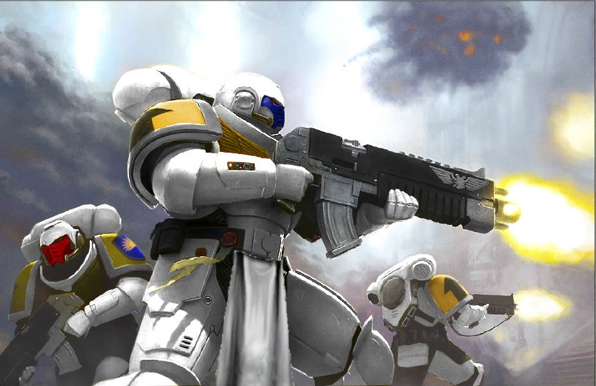 At some point in the Indomitus Crusade, the Dawn Guardians were assigned to the war zone on the Civilized World of White Reach that was besieged by a collective of Word Bearer hosts. The vast horde of cultists and Heretic Astartes had pressed the Imperial lines to the point of breaking through. In one area, they had broken through to the high level where a large archive containing millennia's worth of history resided. With most forces tied down elsewhere, only a meagre garrison was left to defend the bridge that connected the archive to the other spires. Desperate to preserve the knowledge within the archive, the Historitors sent out a distress call for reinforcements. This call was answered by the Dawn Guardians who arrived in force.