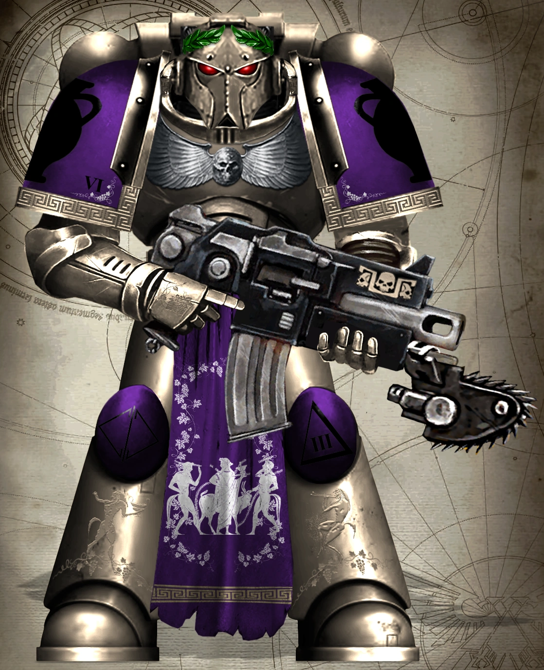 The Dionysus Revellers were a formerly Loyalist Chapter of the Adeptus Astartes. They were created during the 8th Founding in the middle centuries of M35, from the proud lineage of the heroic and much-lauded Ultramarines. During this tumultuous era, the Imperium was rift with civil war and terrible conflicts, which resulted in the Emperor's realm being fractured for almost nine centuries. This conflict came to be known as the Nova Terra Interregnum. During this era, several Foundings of newly formed Space Marine Chapters were created to help stabilise the Imperium and to put down this uprising.