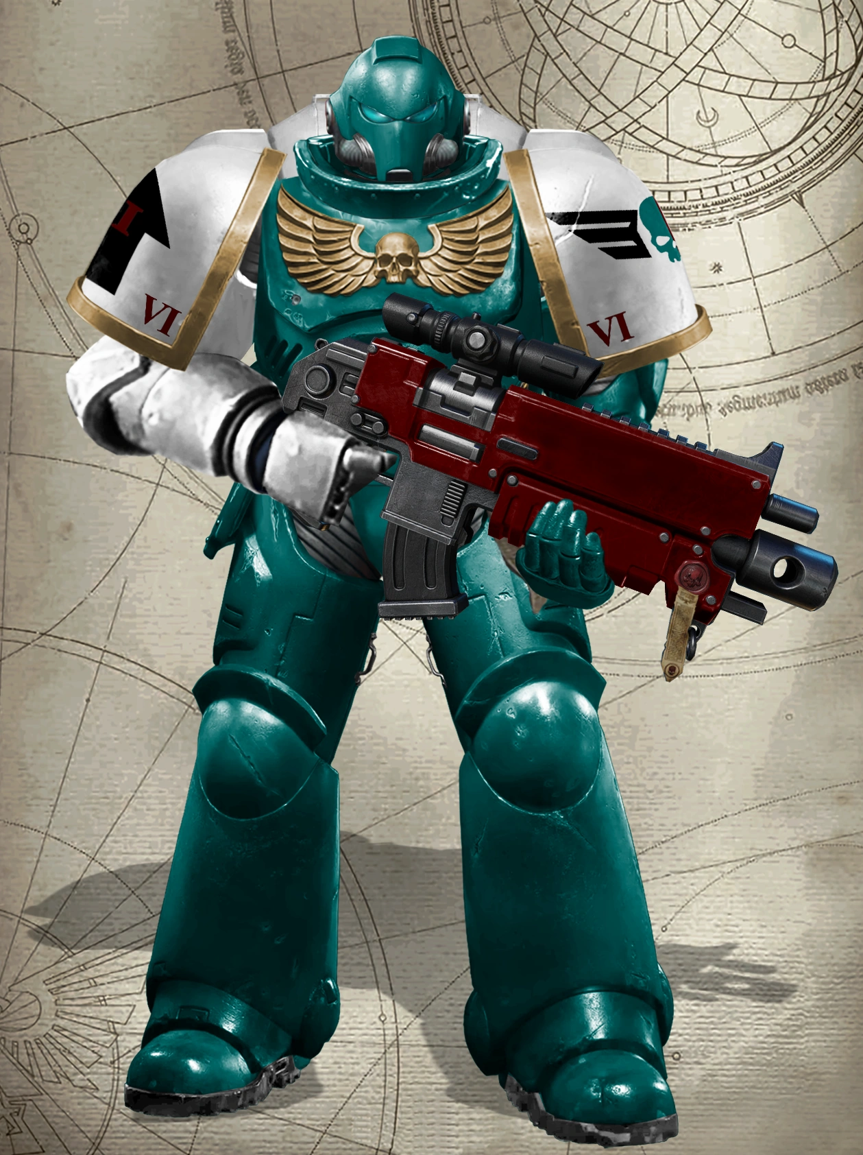 The skull symbolizes both the Astartes and the Imperium. The deep teal half reflects the chapter's connection to their storm-ravaged homeworld of Tornaxis, while the dark crimson signifies their ties to the Adeptus Mechanicus.