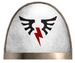 The inset of the right shoulder pauldron is also blue. Chapter markings and unit designations are white. The white squad specialty symbol -- battleline, close support, fire support, Veteran or command -- is displayed on the right shoulder pauldron, while the inset of the left shoulder pauldron is white and proudly displays the Chapter's iconography. The company number is displayed as a High Gothic numeral on the left knee plate or as a black High Gothic numeral placed in the centre of the squad specialty symbol on the left shoulder plate.
