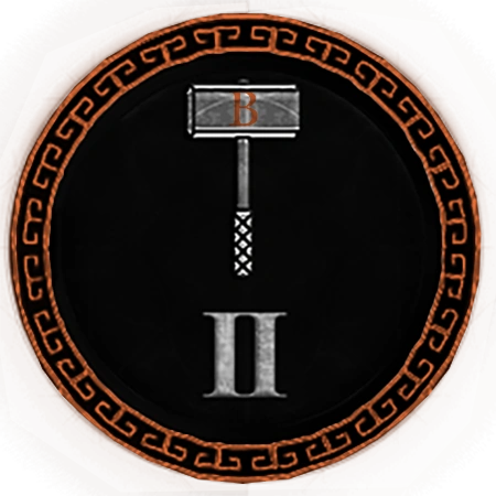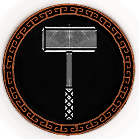 The Hammers of Antaeus' Chapter badge is an white circular greek border with two crossed hammers in the center.