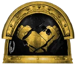 The Hammers of Antaeus' wear jet black power armour with burnished orange as a secondary colour on the armourial insets. The Aquila or Imperialis affixed to their chest plates is also burnished orange.
