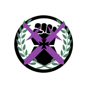 Centered over this symbol is a pair of crossed swords in bold royal purple, blades pointing downward. These may symbolise martial tradition, internal duality, or the eternal crusade of the Knights. At the intersection of the blades is a black coloured Maltese Cross, reminiscent of the symbol utilised by the ancient order of the Templar Brethren of the VIIth Legion of old. This icon symbolises the Knights' unequalled zeal, relentless determination and matchless skill as peerless warriors.