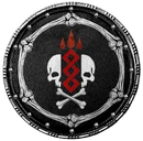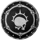 - 9th Harrow: A large white forward-facing skull overlaying above an ancient Fire Support icon and centered within an upside-down triangle consisting of three femurs.