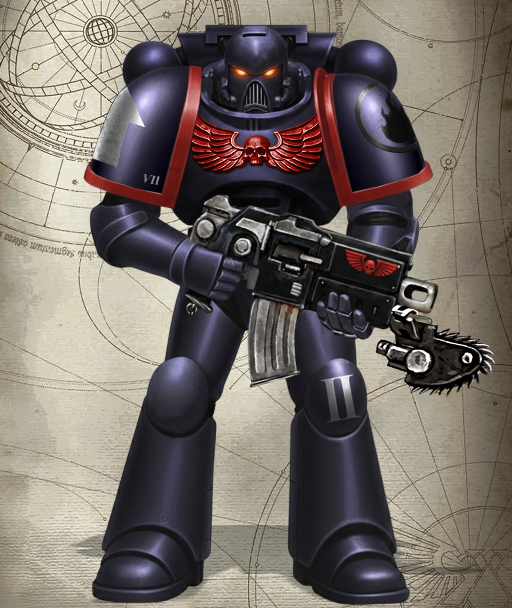 - Melanchromic Twist: Their skin darkens significantly post-implantation, turning gray or coal-black with a faint ember glow in their veins when under duress or prayer. This has led to beliefs that they are half-spirit, half-Astartes.