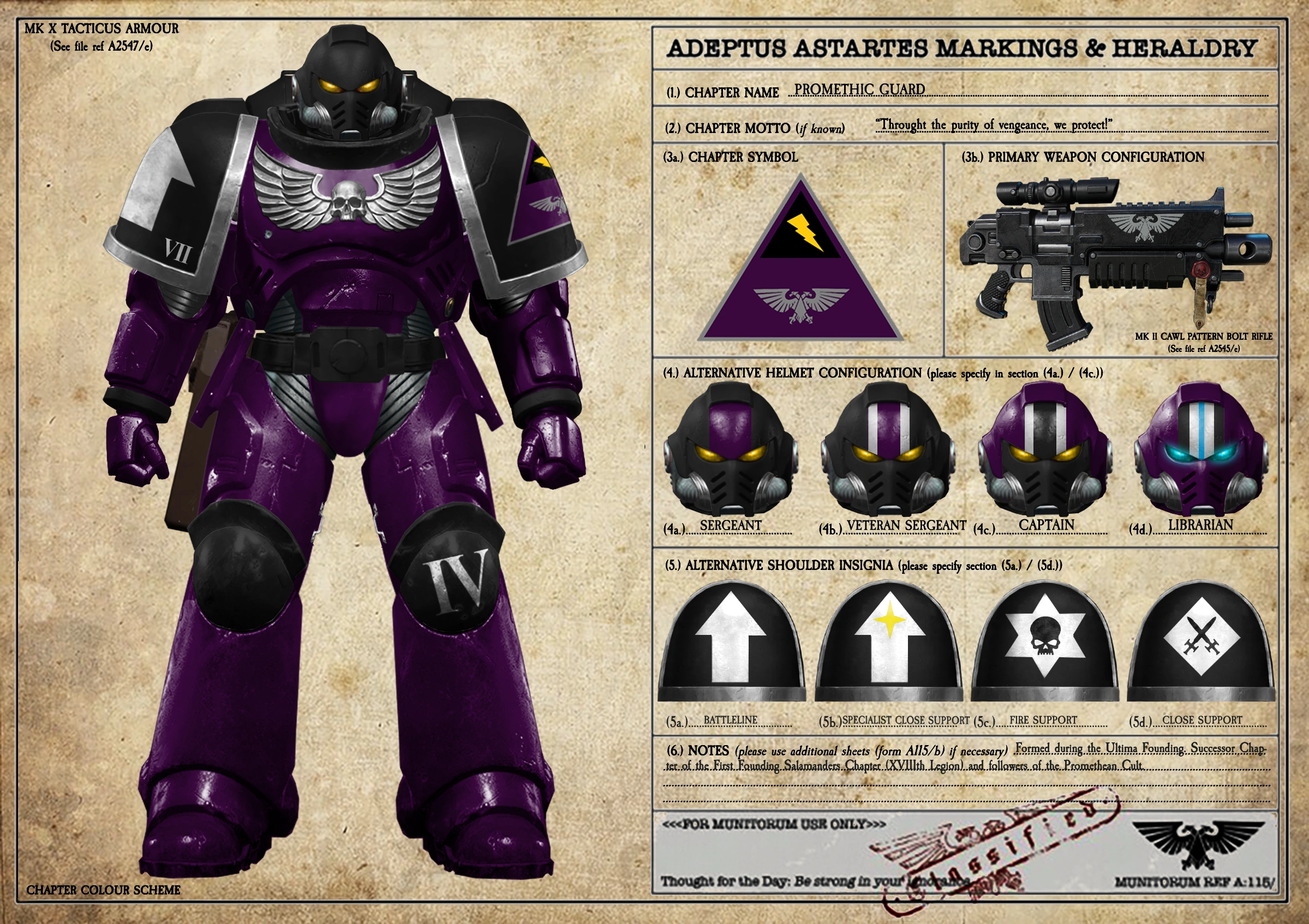 - Fire/Heavy Support - As the name suggests, Heavy Support Marines carry the largest weapons of the chapter. Primary choices of weapons include Multi-Meltas, Plasma Incinerators and Heavy Bolters. They are placed throughout a battlefront where required, but will normally be assigned to bolster the primary battleline or cover retreating civilian populations during evac operations. All units of this classification are equipped with Mark X Gravis Pattern Power Armour. They are the bulwarks of The Promethic Guard and are primarily focused towards defensive combat styles, holding lines and covering other units.