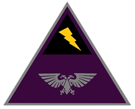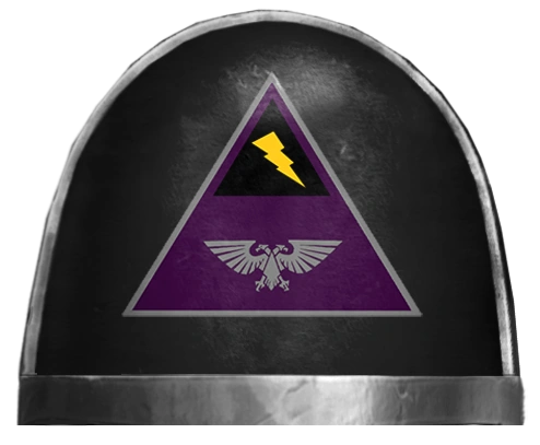The Promethic Guard's Chapter badge takes the form of a large dark purple delta (triangle) symbol outlined in silver. A smaller black coloured delta is stenciled on the top portion of this central symbol; a small yellow lightning bolt centered within. On the bottom portion of the large delta symbol is a large silver Aquila - the symbol of the Imperium of Man.