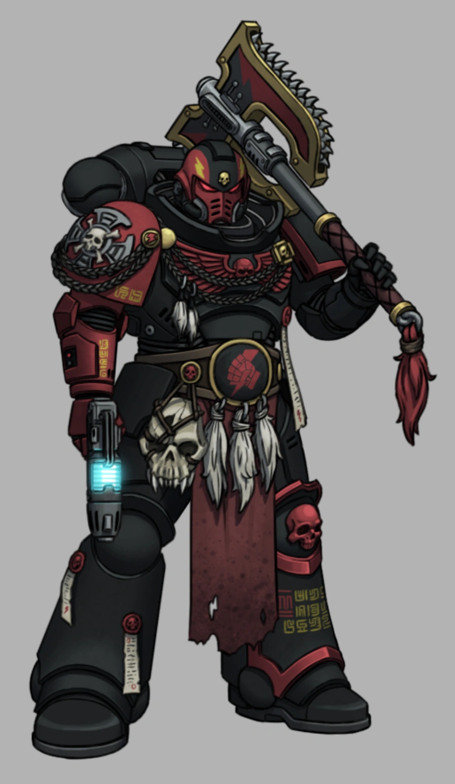 Dawn Breaker: A relic found during the Liberation of Bastion V, when Rain killed the Orkboss of the Waaagh. There the Orkboss was carrying a double chain axe, Rain would beat the Orkboss in single combat, though with some major injury he was able to cut off the Orkboss's arm holding the double chain axe. then picking up the chainaxe he decaptiated the Orkboss's head with it. After such a victory over the Orks he found that the double chain axe he used to kill the Orkboss with was not of Ork made but looked Imperium made, he decided to take the chain axe for his personal weapon instead, a symbol of his right to lead. Later on he found out that the chain axe used to belong to another chapter master of an another Successor chapter that was eliminated by the same Orkboss he killed. A Chapter he planned to honor by wielding the chain axe into battle killing as much Orks with it to make sure those who used to wield it can feel the Ork's demise.