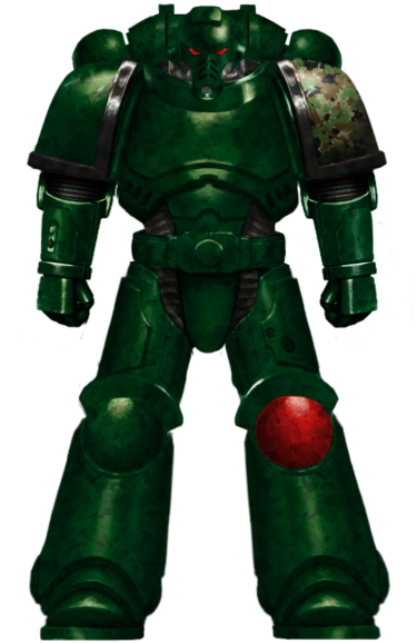The chapter badge of the Sentinels of Cadia is considered rather bland for a Space Marine Chapter especially as it does not adhere to the Codex Astartes. The ancient-Terran camouflague plays into the utilitarian aspects of the Chapter. it is made up of a sandy green, brown maroon and various greens.