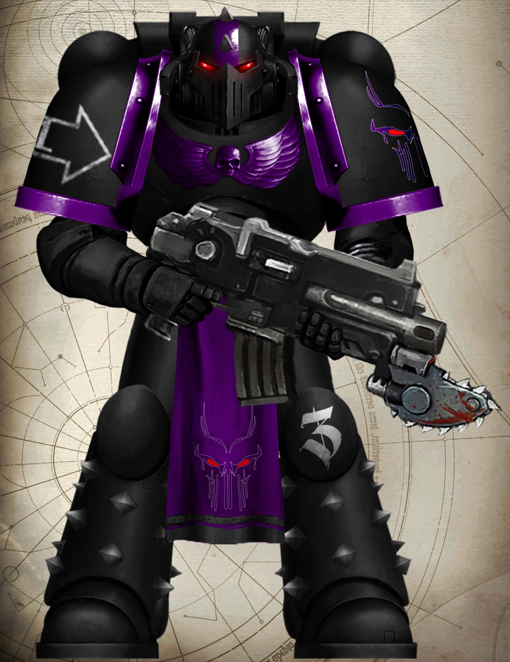 The Shadow Phantoms primarily wear black-coloured power armour with the exception of their shoulder pauldron trim and the Aquila or Imperialis worn on the plastron (chest guard). A white-coloured, open-faced squad specialty symbol on the right armorial designates a battle-brother's assigned squad specialty (Fire Support, Battleline, Close Support, Veteran and Command). A small white-coloured gothic numeral stencilled within the squad specialty symbol indicates a battle-brother's assigned squad. A white-coloured gothic numeral stencilled on the left poleyn indicates a battle-brother's assigned company. The Shadow Phantoms are known to decorate their armour with a variety of spikes and studs, adding to their overall ferocious appearance.