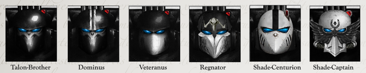 From left-to-right: Talon-Brother (Battle-Brother), Dominus (Sergeant), Veteranus (Veteran Marine), Regnator (Veteran Sergeant), Shade-Centurion (Lieutenant), Shade-Captain (Captain).