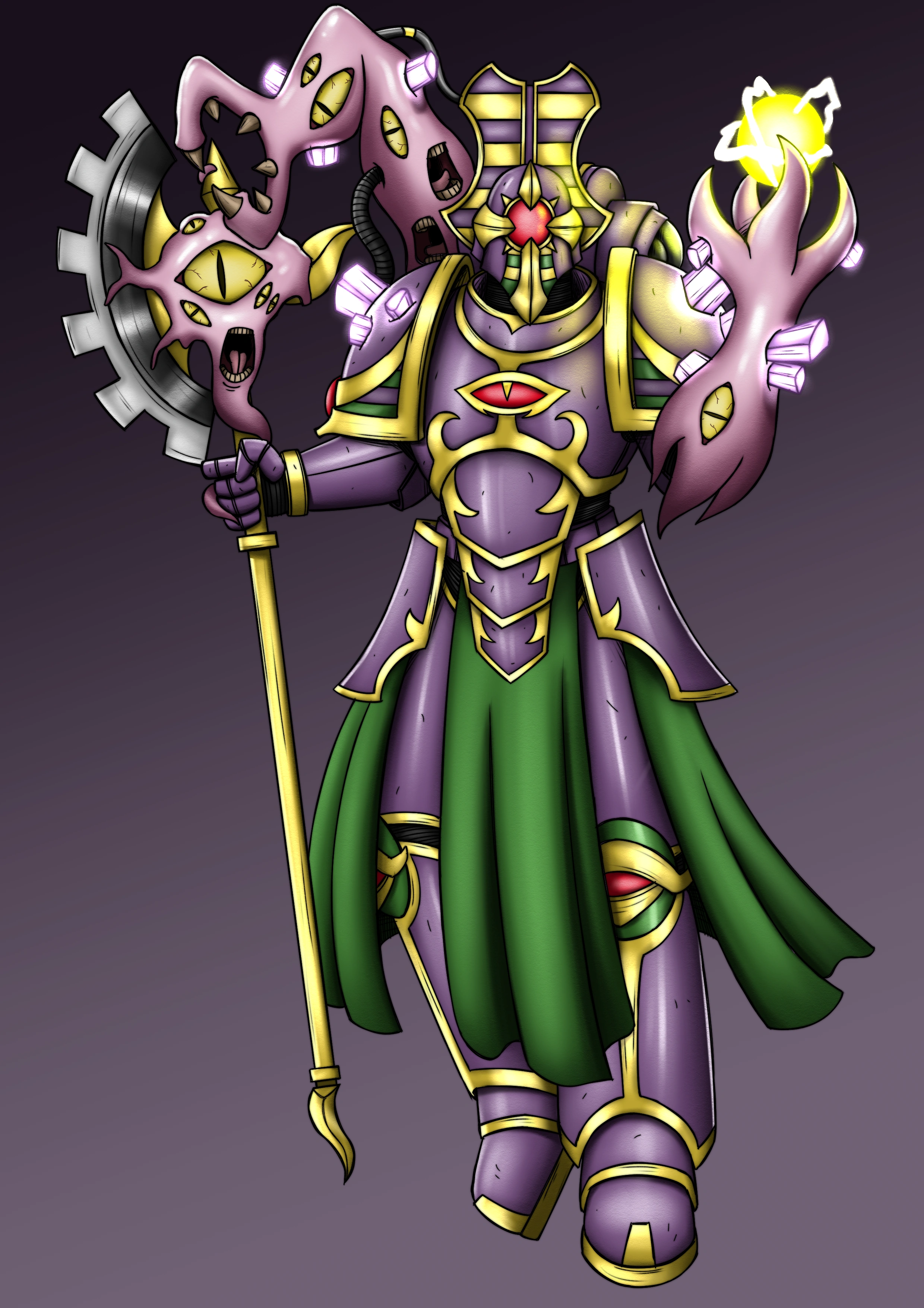 Kamuza the Glazing Eye - The Vitrifiers' Chief Emissary and the Master of the Scattered Shards, Kamuza was a former Numerologist of the 7th Fellowship of the Thousand Sons Legion. His intimate understanding of weapons and technology utilized by his Legion made him a valuable asset along with his other Numerologists on numerous fronts during the Great Crusade, though Kamuza would sometimes find opportunities to help repair the technology and vehicles used by the everyday human on worlds the Thousand Sons Legion would help liberate. It was something he would find satisfaction in and would make close connections with many of this Legion's assigned Remembrancers, officers of the Spireguard, his own Life Ward bodyguards, and even fellow legionary: Nehabrak. Though things changed drastically for the upbeat Astartes since the unfavorable outcome of the Council of Nikaea on the usage of Psykers, something of which Kamuza practiced heavily in through his membership in the Cult of the Pyrae though like a majority of his Legion would continue to practice it in secret. His ideals in the Imperium shattered during the Burning of Prospero when the Space Wolves ravaged their beautiful world and slaughtered many of the people Kamuza held dearly. Kamuza would be among those that help evacuate civilians and Spireguard units into the Pyramid of Photep, one of the only places on Prospero deemed to be safe from the harsh invasion and always made sure to place himself between them and the Wulfen that began to break through the defensive lines of the Pyramid. Though as he and the remaining Thousand Sons teleported into the Warp, he would soon come to hear the screams of the numerous innocent Prosperine inhabitants left behind and slaughtered by the hands of the vicious Space Wolves, an act that would drive the grief stricken Astartes nearly insane. Though the Rubric of Ahriman would be the final nail in the coffin that would change the Thousand Sons forever, thus the last bits of Kamuza's sanity would fade away, and more literally with the Numerologist's loyal Life Ward bodyguards who transformed into the many automata-like Rubric Marines. In this moment Kamuza fully submitted himself to Tzeentch who gifted him heavily by mutating many of his mechanical parts and the mechadendrite with mutations harboring countless eyes and screaming, jabbering, mouths. Eventually he would find purpose when he was found by his old friend: Nehabrak, who had need of his scientific and civil nature in creating a Spy Network to better navigate the Realm of Mankind without drawing much attention to his ultimate goal of leading humanity into an Age of Vitrification. Interpreting this chance encounter as a way of finding something more fulfilling in his life, Kamuza agreed and set forth from the Eye of Terror to lay the seeds for what would eventually become one of the most extensive Chaos Cults in the galaxy: The Scattered Shard.