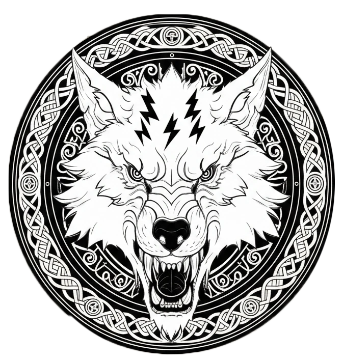 The Thunder Wolves' Chapter icon takes the form of a a Celtic wolf's head with lightning bolt markings on its fur, encircled by a knotwork border, with feral eyes and a Celtic shield behind it. It's typically painted white to contrast the black pauldron.