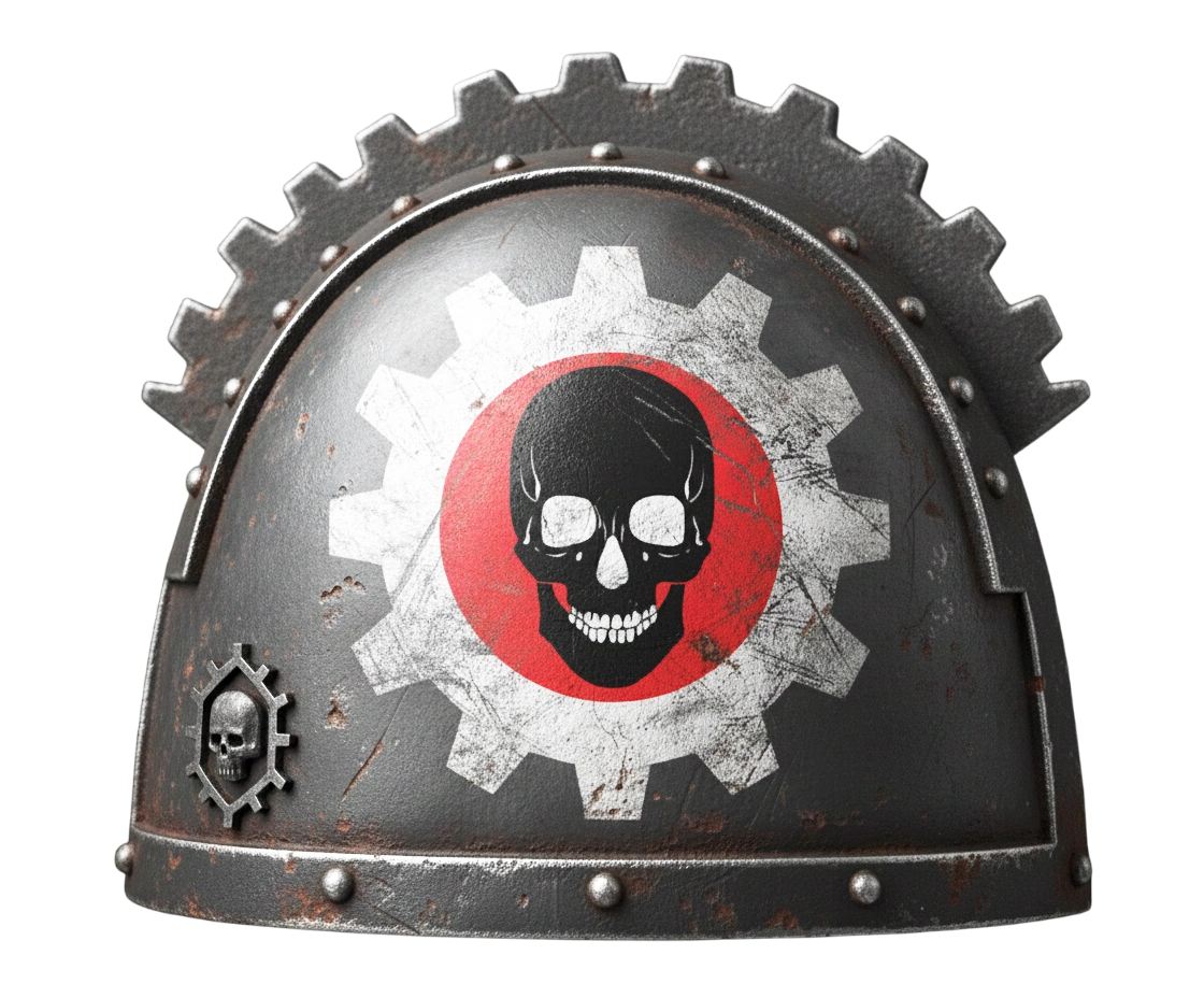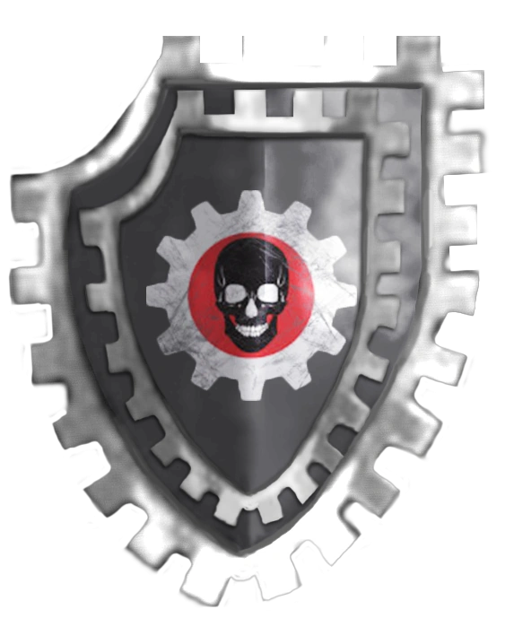 The Warmachines' chapter icon takes the form of a large black skull inside a red circlet and centered within a large white cog. This emblem represents the neverending grinding cogs of war while the red circlet represents their strong ties with the Adeptus Mechanicus.