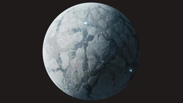 Vetr is a harsh, desolate moon, characterized by its unyielding icy surface. The moon is perpetually shrouded in a cold, silvery twilight, with the surface covered in a thick layer of ice that stretches as far as the eye can see. The icy crust is riddled with deep fissures and crevasses, where the cold light of distant stars glints off sharp, crystalline formations. Beneath the icy crust lies a vast, deep ocean, its presence hinted at only by the occasional steam vent or the mysterious glow of bioluminescent creatures seen through the ice. The ocean's depths remain largely unexplored, and its waters are said to be teeming with ancient, mysterious lifeforms, untouched by the passage of time.