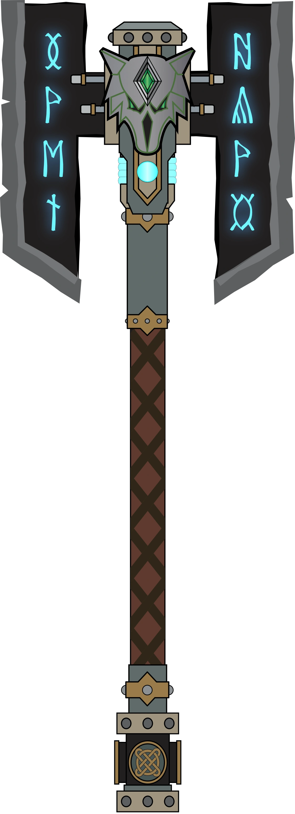 - Runefang - A weapon of mythic make and peerless craftsmanship, is borne into battle by Varin Drakekissed, Jarl of the Drake Wolves. It was forged as a gift by the previous Jarl, Sigurd Drakenwúlf, to mark Varin’s ascension to Thane — a symbol of loyalty, honor, and the weight of command. A double-headed power axe of imposing size, its twin blades are hewn from solid Sjálarún, a rare rune-stone capable of channeling warp-born energies with uncanny precision. The runic matrix woven into its core fuels a potent disruption field, one so fierce that a single well-placed strike can shear through ceramite and pulverize flesh and bone alike. Such is its balance and force that even terminator armor may offer no refuge. Through a binding rune etched into Varin’s gauntlet, Runefang may return to his grasp with a mere gesture, cleaving its path back through friend and foe alike.